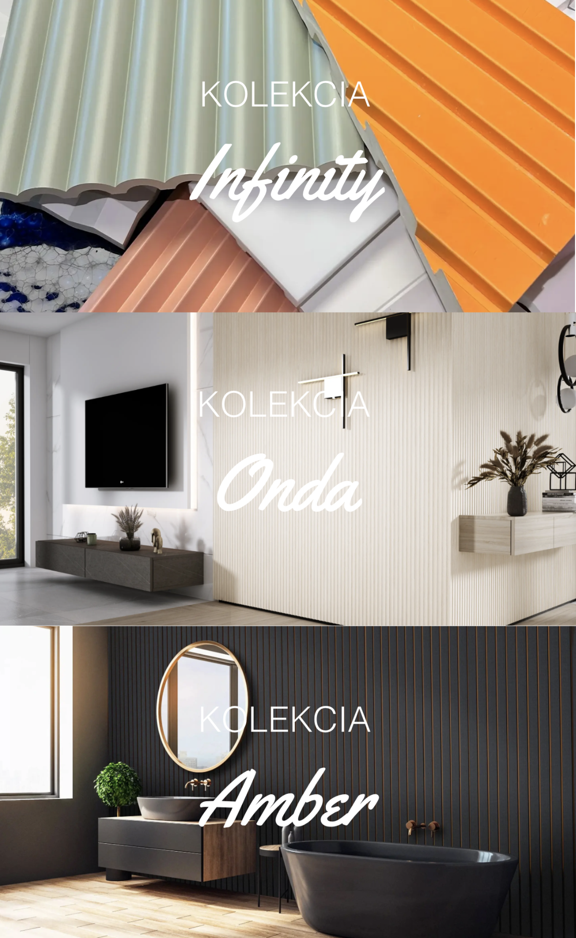 Kolekcia ONDA vyniká moderným dizajnom a trendovými farebnými dekormi. Jemné vlnité lamely vytvárajú elegantný a svieži efekt, ktorý príjemne oživuje priestor. Obklad pôsobí ľahko a harmonicky, vďaka čomu je vhodný do menších aj väčších miestností. Kolekcia je dostupná v štyroch farbách a jednoducho sa kombinuje s modernými interiérmi.