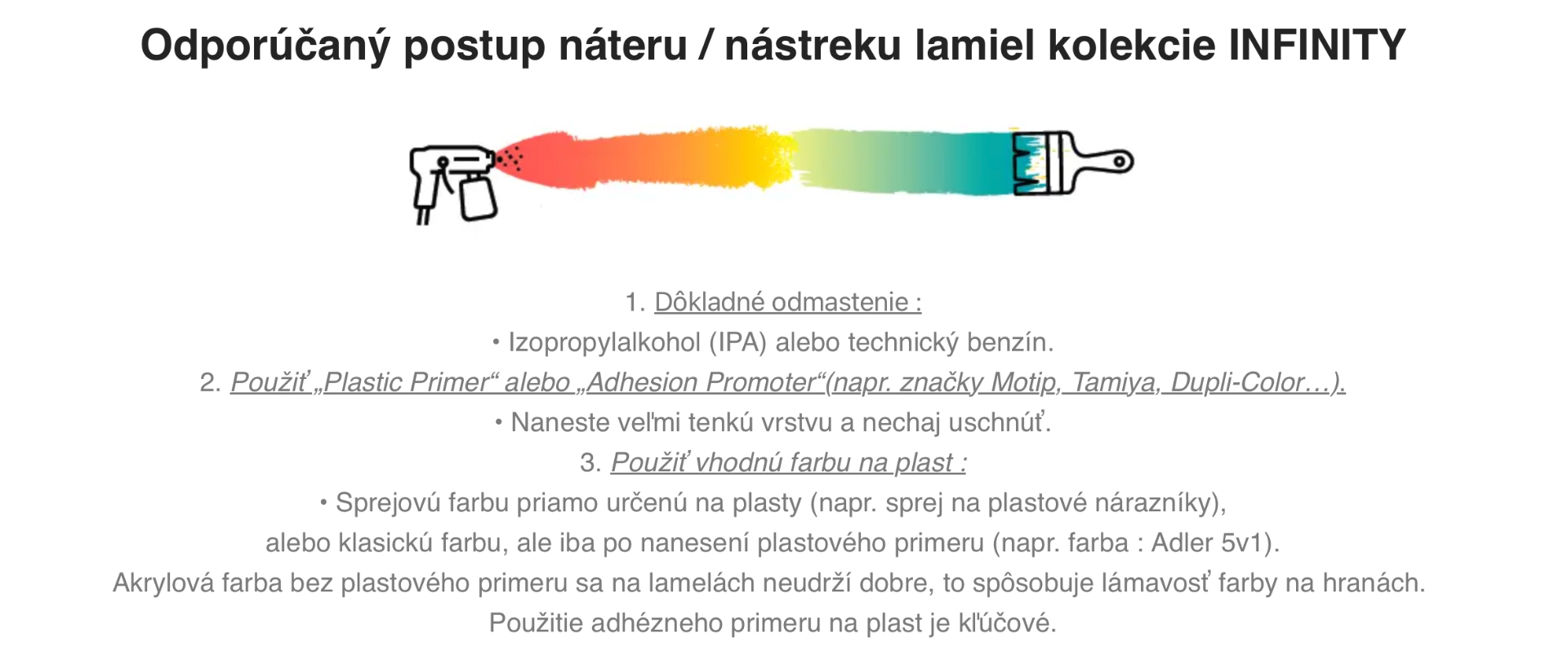 Kolekcia INFINITY ponúka jedinečné možnosti individualizácie vďaka možnosti náteru podľa vlastného výberu. Štyri základné dekory je možné farebne upraviť do neobmedzeného množstva odtieňov, čo umožňuje vytvoriť originálne a personalizované riešenie pre akýkoľvek interiér. Lamely sa ľahko upravujú a hodia sa do všetkých typov priestorov.